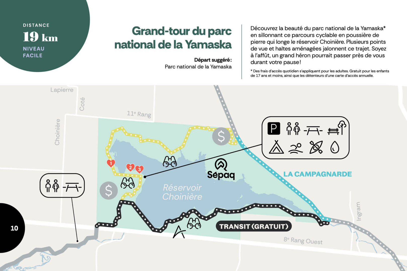 Découvrez la beauté du parc national de la Yamaska* en vélo, loin des voitures. Le parcours cyclable en poussière de pierre, sillonne le parc autour du réservoir Choinière.