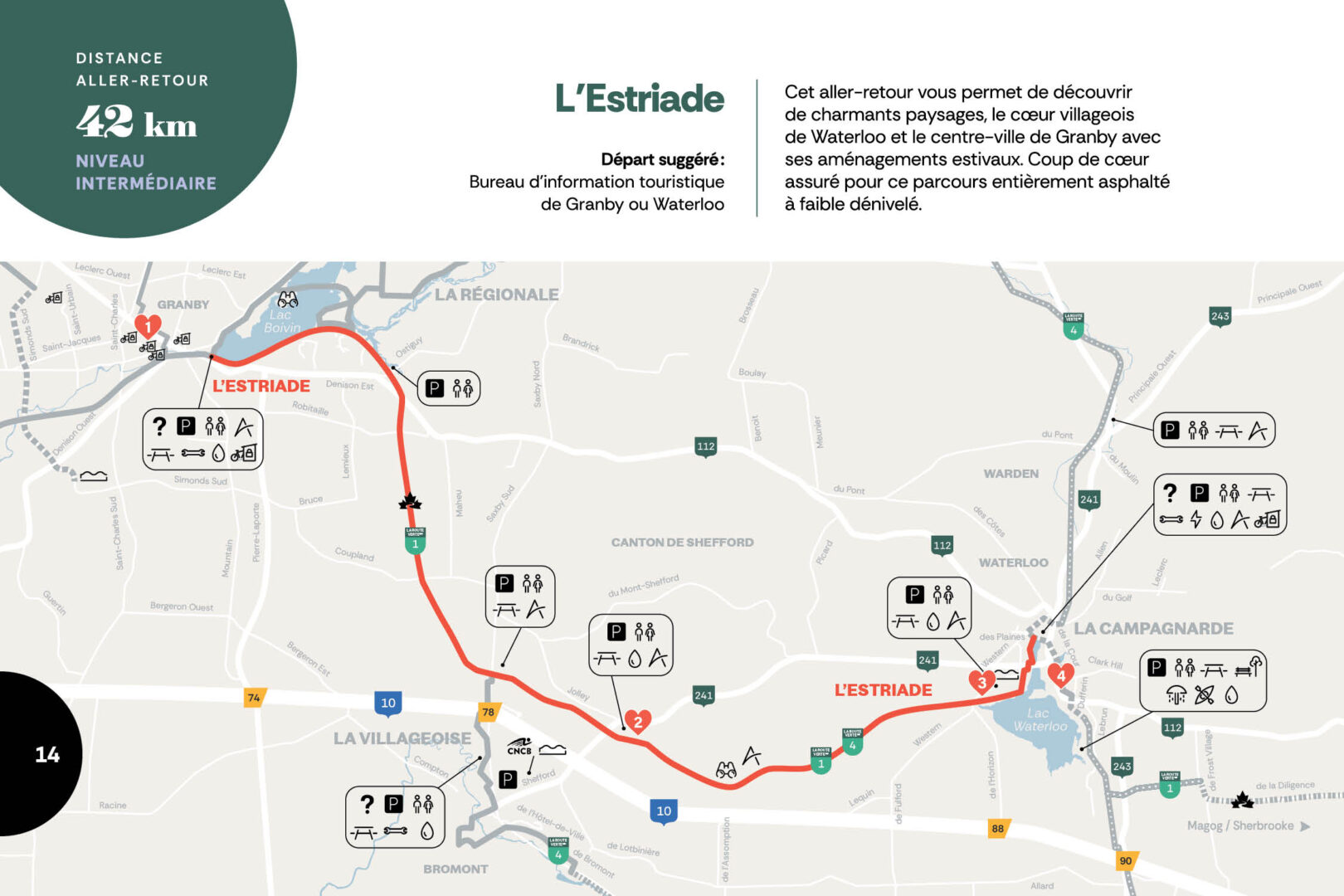 Cet aller-retour de 42 km vous permet de découvrir de charmants paysages, le cœur villageois de Waterloo et le centre-ville de Granby avec ses aménagements estivaux.